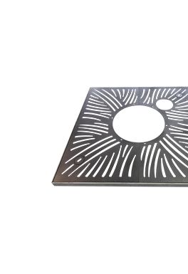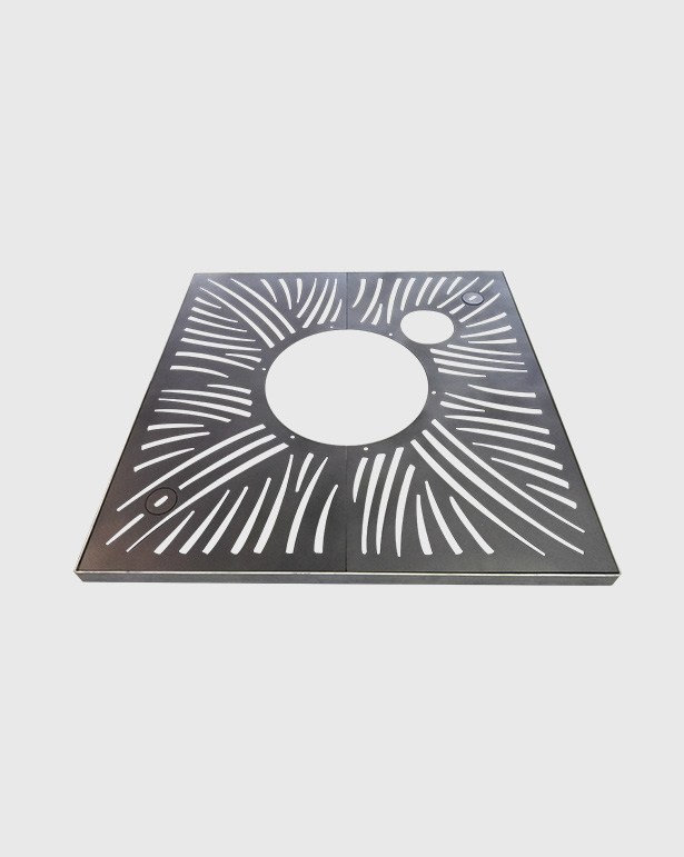 Product Description: Tree grate made of solid cast iron. Outside shape square, inner opening square. Consisting of four segments, two watering covers.